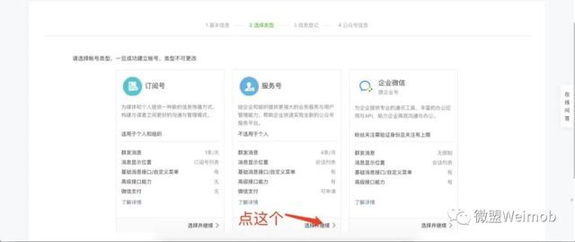 另外,微信公眾號有訂閱號,服務號,企業微信三種類型,對于微信公眾號的類型選擇,請提前根據公眾號的用途,考慮清楚,選擇對應的類型,而對于企業來說,選擇服務號是最好的選擇,所以接下來,我們將以服務號為例,來為大家詳細介紹其申請流程。
